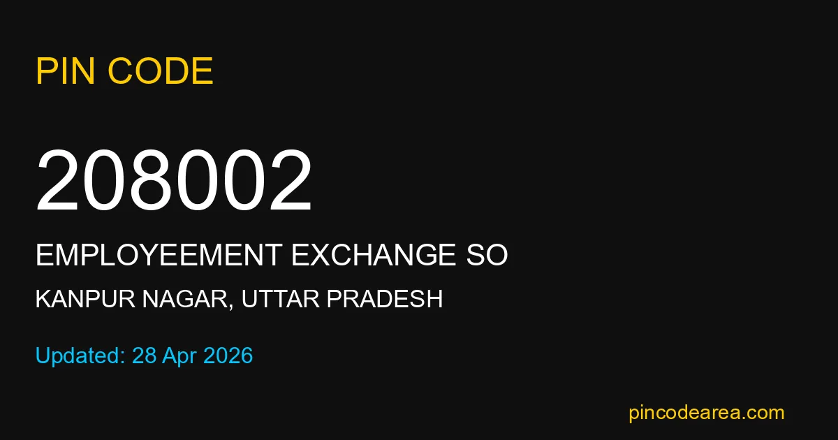 208002 PIN Code is assigned to Employeement Exchange SO Post Office located in Kanpur Nagar district of Uttar Pradesh. It helps identify the exact delivery area for postal and courier services.