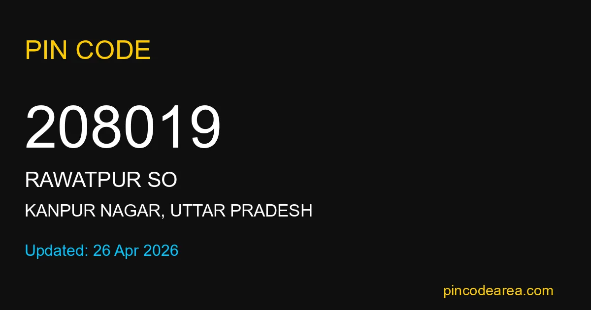 208019 PIN Code is assigned to Rawatpur SO Post Office located in Kanpur Nagar district of Uttar Pradesh. It helps in identifying the exact delivery area.