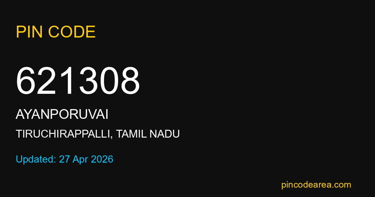 If you are searching for accurate location details, 621308 helps identify the exact postal region of Ayanporuvai in Tamil Nadu.