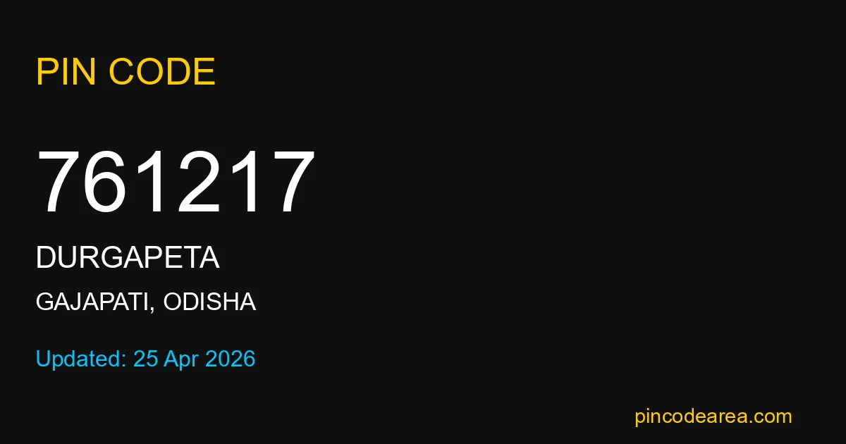 761217 PIN Code is assigned to Durgapeta Post Office located in Gajapati district of Odisha. It helps in identifying the exact delivery area.