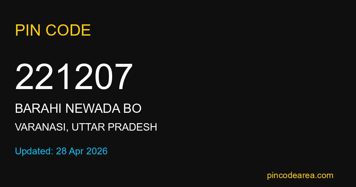 221207 PIN Code belongs to Barahi Newada BO Post Office in Varanasi district of Uttar Pradesh, India. This area mainly includes local residential and rural regions where India Post ensures timely mail and parcel delivery services.