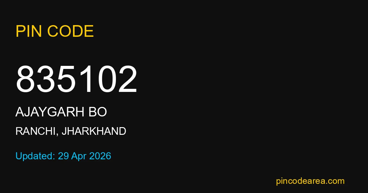 835102 PIN Code is assigned to Ajaygarh BO Post Office located in Ranchi district of Jharkhand. It helps identify the exact delivery area for postal and courier services.