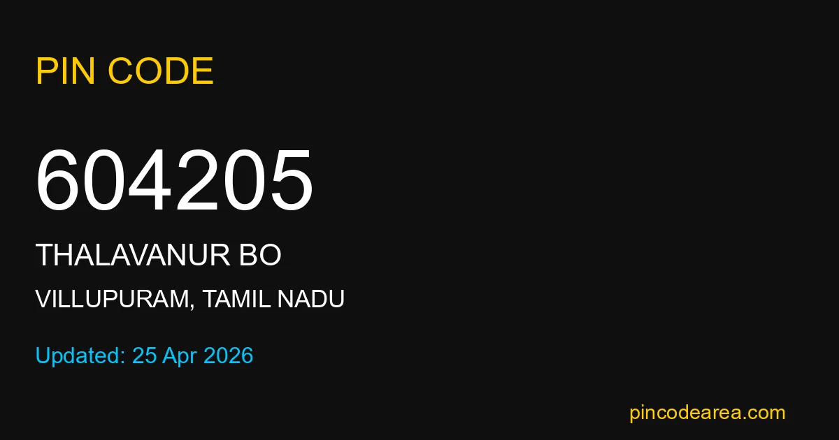604205 PIN Code belongs to Thalavanur BO Post Office in Villupuram district of Tamil Nadu, India. This area mainly includes local residential and rural regions where India Post ensures timely mail and parcel delivery services.