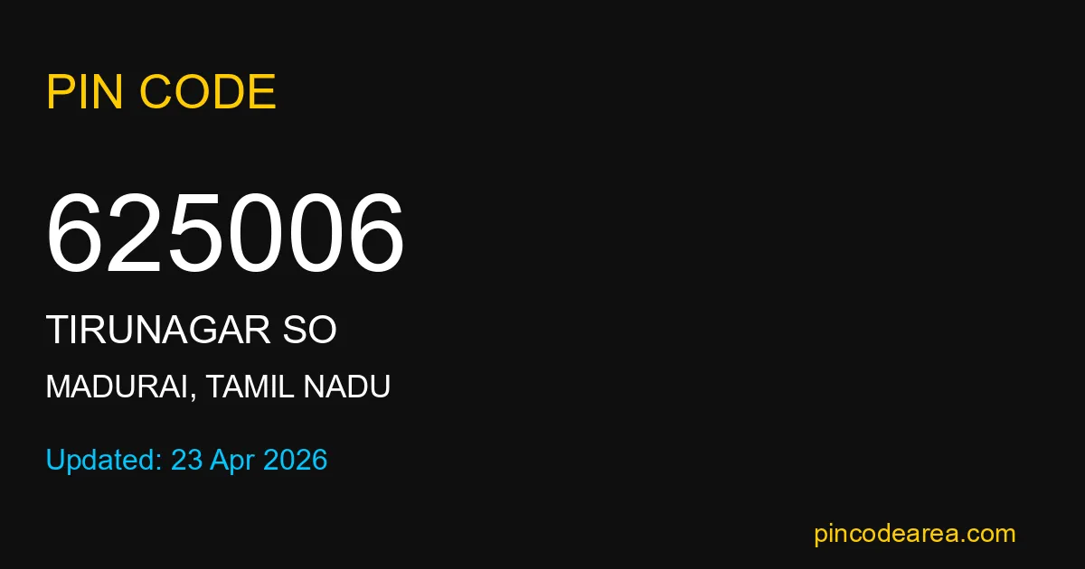 If you are searching for accurate location details, 625006 helps identify the exact postal region of Tirunagar SO in Tamil Nadu.