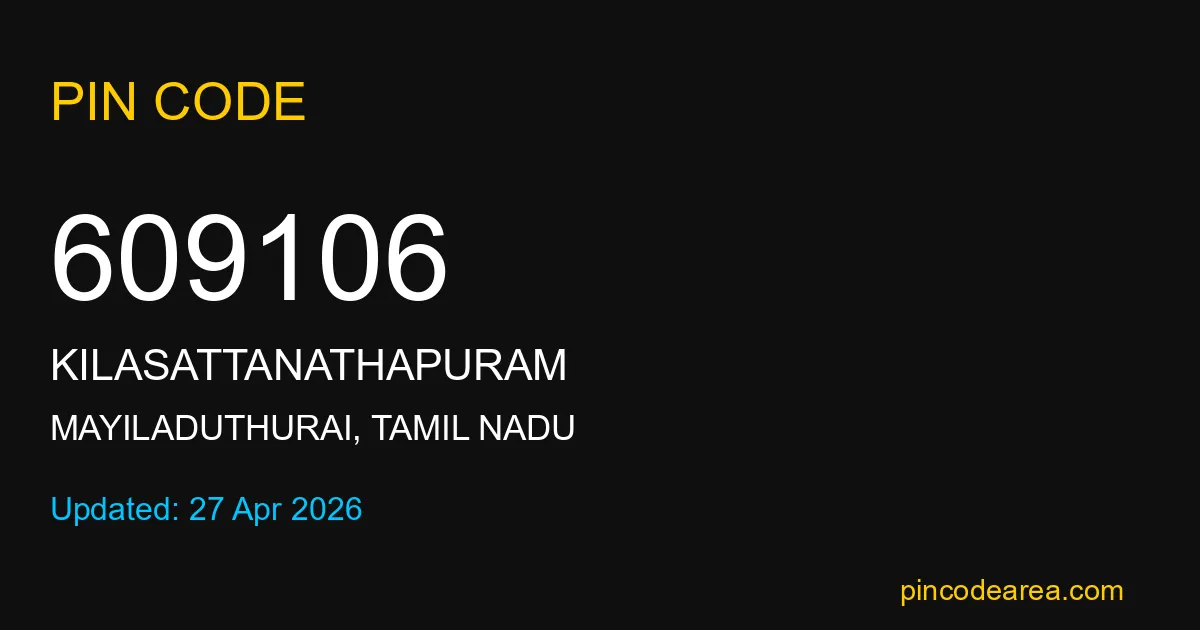 609106 PIN Code is assigned to Kilasattanathapuram Post Office located in Mayiladuthurai district of Tamil Nadu. It helps identify the exact delivery area for postal and courier services.