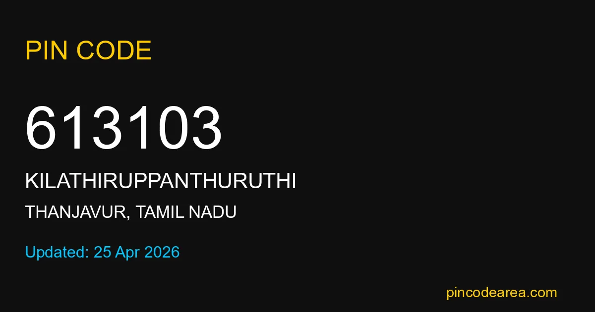613103 PIN Code belongs to Kilathiruppanthuruthi Post Office in Thanjavur district of Tamil Nadu, India. This area mainly includes local residential and rural regions where India Post ensures timely mail and parcel delivery services.