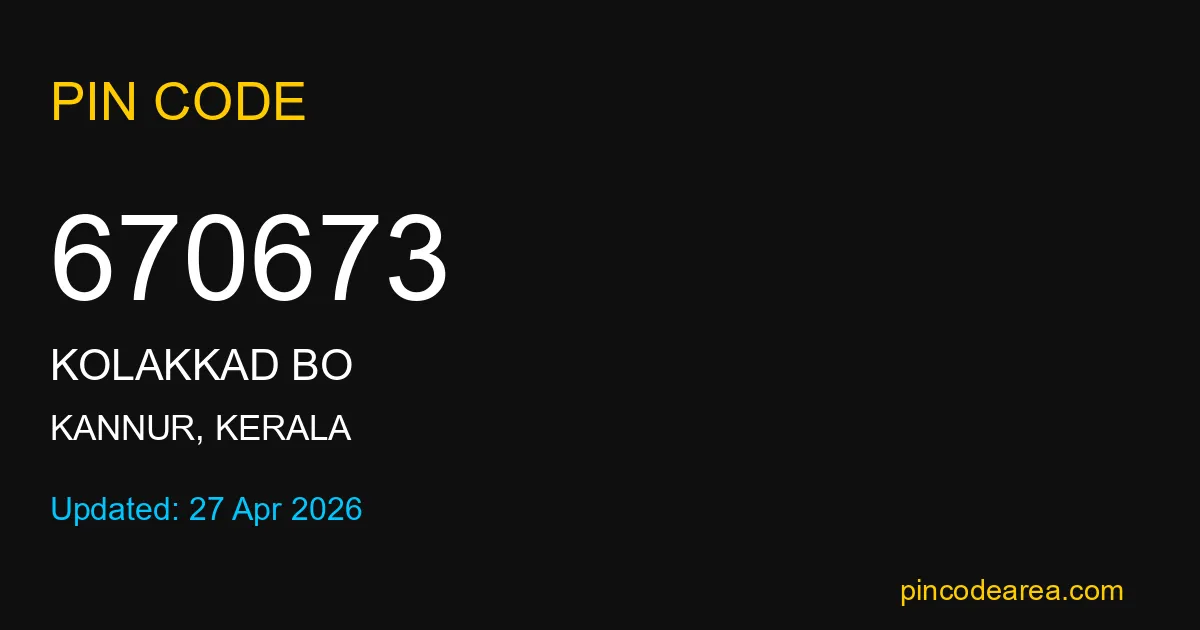 670673 PIN Code is assigned to Kolakkad BO Post Office located in Kannur district of Kerala. It helps identify the exact delivery area for postal and courier services.