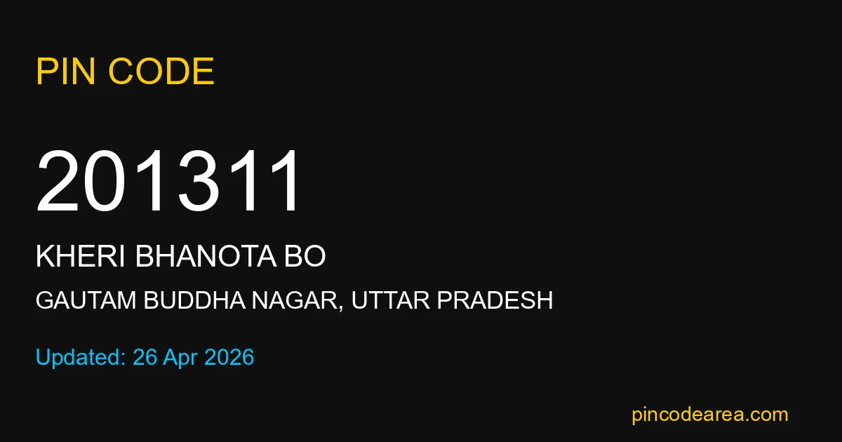 201311 PIN Code is assigned to Kheri Bhanota BO Post Office located in Gautam Buddha Nagar district of Uttar Pradesh. It helps in identifying the exact delivery area.