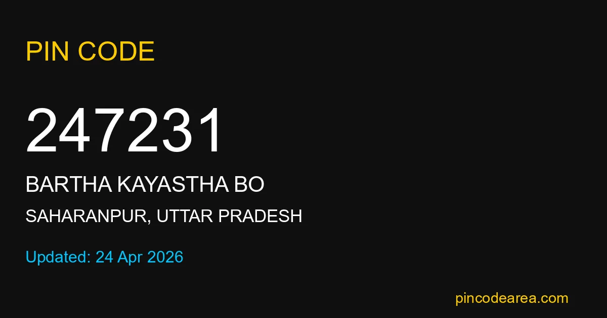 247231 PIN Code belongs to Bartha Kayastha BO Post Office in Saharanpur district of Uttar Pradesh, India. This area mainly includes local residential and rural regions where India Post ensures timely mail and parcel delivery services.