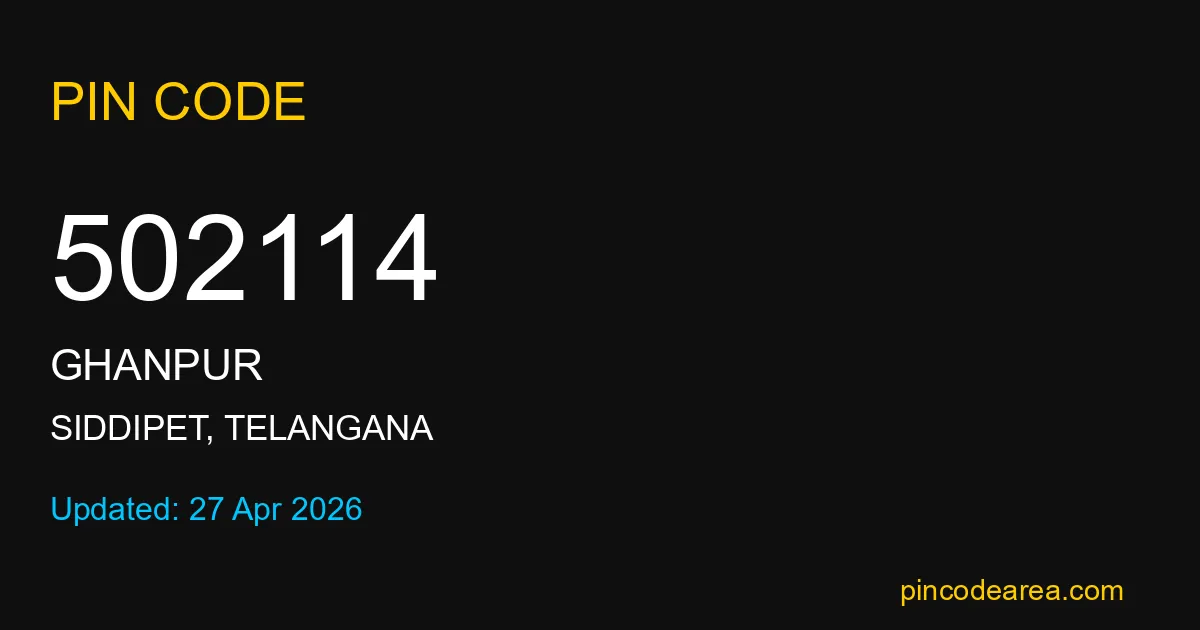 502114 PIN Code is assigned to Ghanpur Post Office located in Siddipet district of Telangana. It helps identify the exact delivery area for postal and courier services.