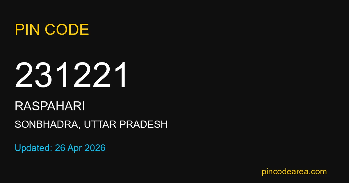 231221 PIN Code is assigned to Raspahari Post Office located in Sonbhadra district of Uttar Pradesh. It helps in identifying the exact delivery area.
