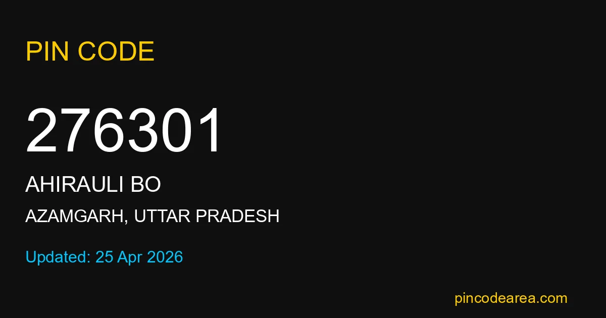276301 PIN Code belongs to Ahirauli BO Post Office in Azamgarh district of Uttar Pradesh, India. This area mainly includes local residential and rural regions where India Post ensures timely mail and parcel delivery services.