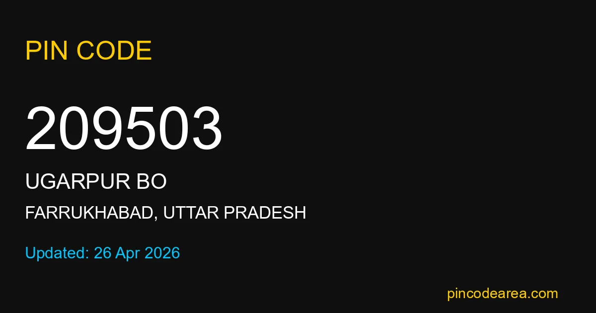 209503 PIN Code is assigned to Ugarpur BO Post Office located in Farrukhabad district of Uttar Pradesh. It helps identify the exact delivery area for postal and courier services.