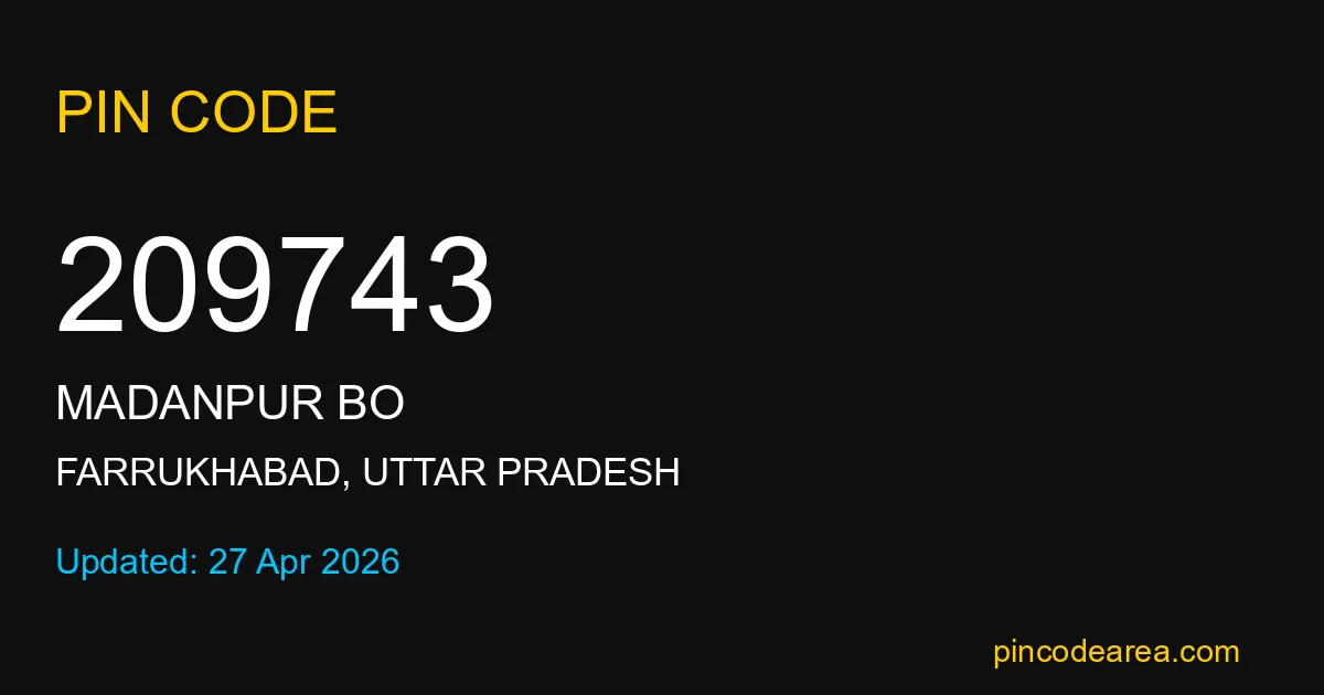 209743 PIN Code is assigned to Madanpur BO Post Office located in Farrukhabad district of Uttar Pradesh. It helps identify the exact delivery area for postal and courier services.