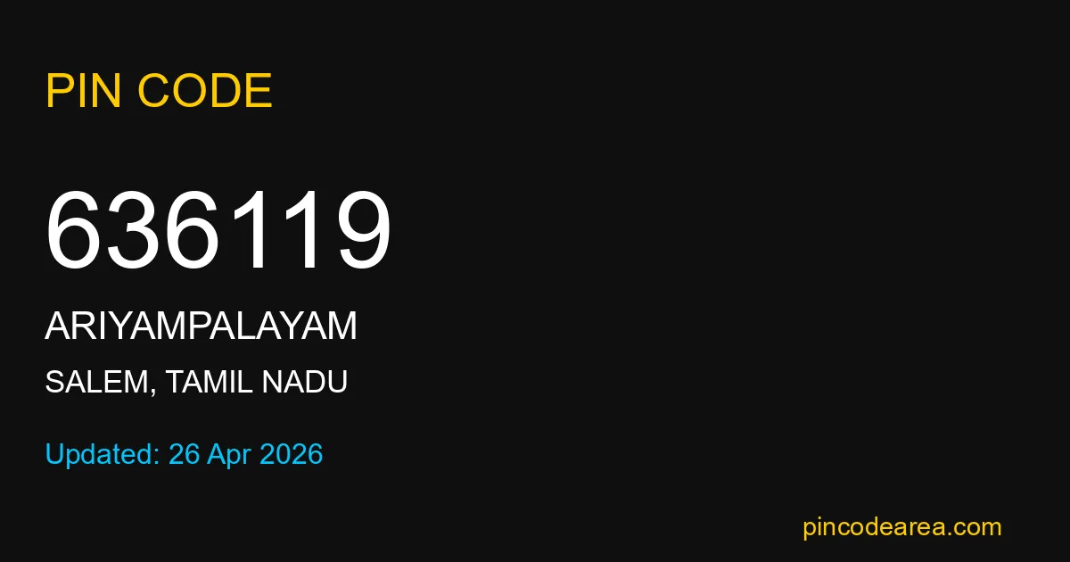 636119 PIN Code is assigned to Ariyampalayam Post Office located in Salem district of Tamil Nadu. It helps identify the exact delivery area for postal and courier services.