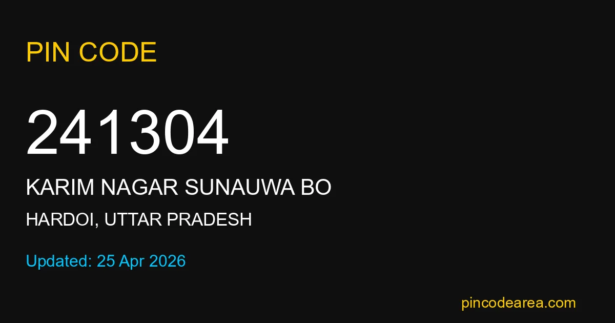241304 PIN Code is assigned to Karim Nagar Sunauwa BO Post Office located in Hardoi district of Uttar Pradesh. It helps in identifying the exact delivery area.