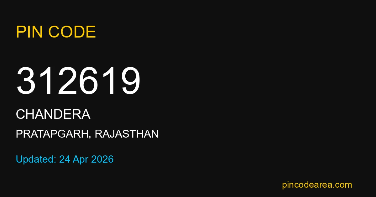 312619 PIN Code belongs to Chandera Post Office in Pratapgarh district of Rajasthan, India. This area mainly includes local residential and rural regions where India Post ensures timely mail and parcel delivery services.