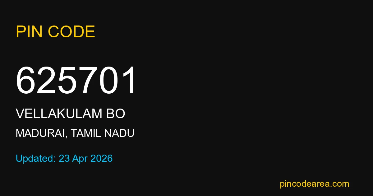 625701 PIN Code belongs to Vellakulam BO Post Office in Madurai district of Tamil Nadu, India. This area mainly includes local residential and rural regions where India Post ensures timely mail and parcel delivery services.