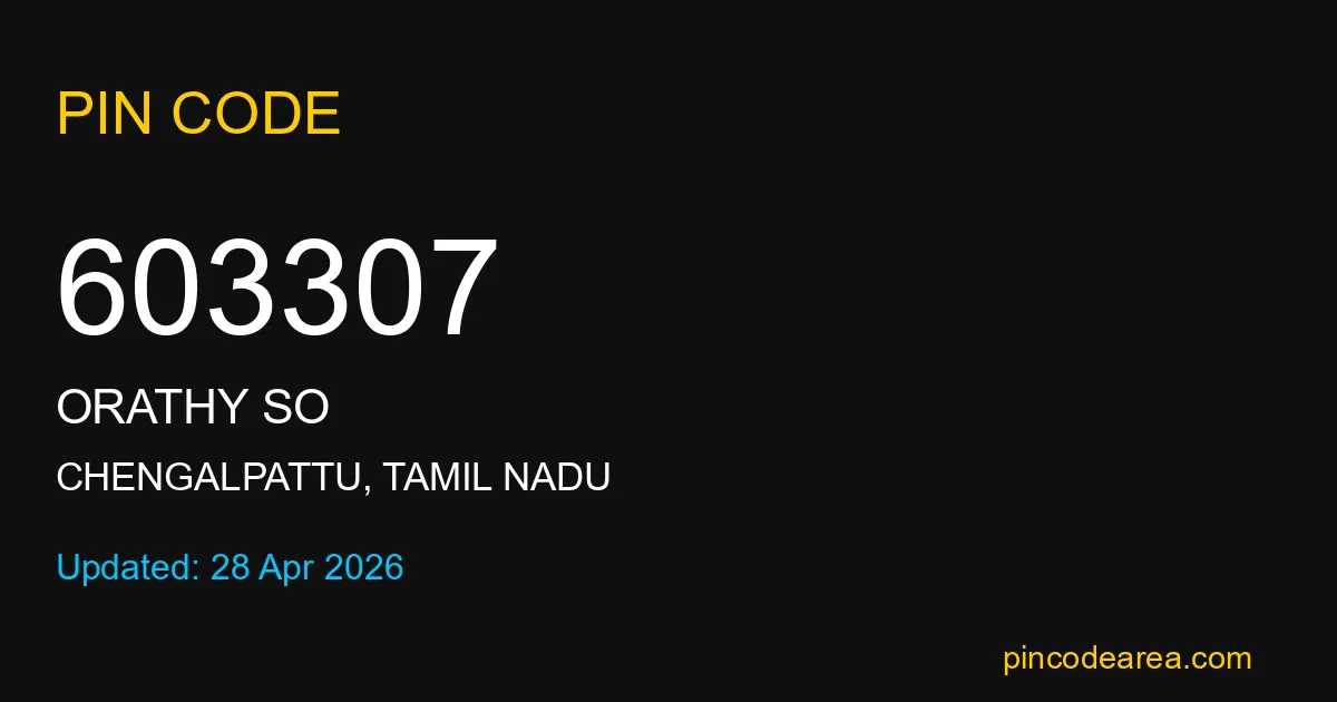 603307 PIN Code is assigned to Orathy SO Post Office located in Chengalpattu district of Tamil Nadu. It helps identify the exact delivery area for postal and courier services.