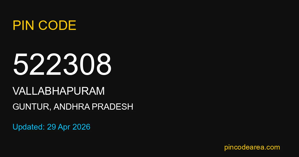 522308 PIN Code is assigned to Vallabhapuram Post Office located in Guntur district of Andhra Pradesh. It helps identify the exact delivery area for postal and courier services.