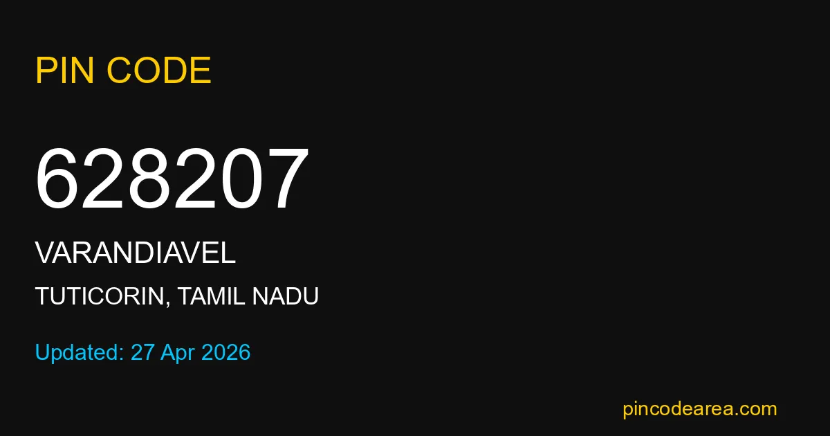 628207 PIN Code is assigned to Varandiavel Post Office located in Tuticorin district of Tamil Nadu. It helps identify the exact delivery area for postal and courier services.