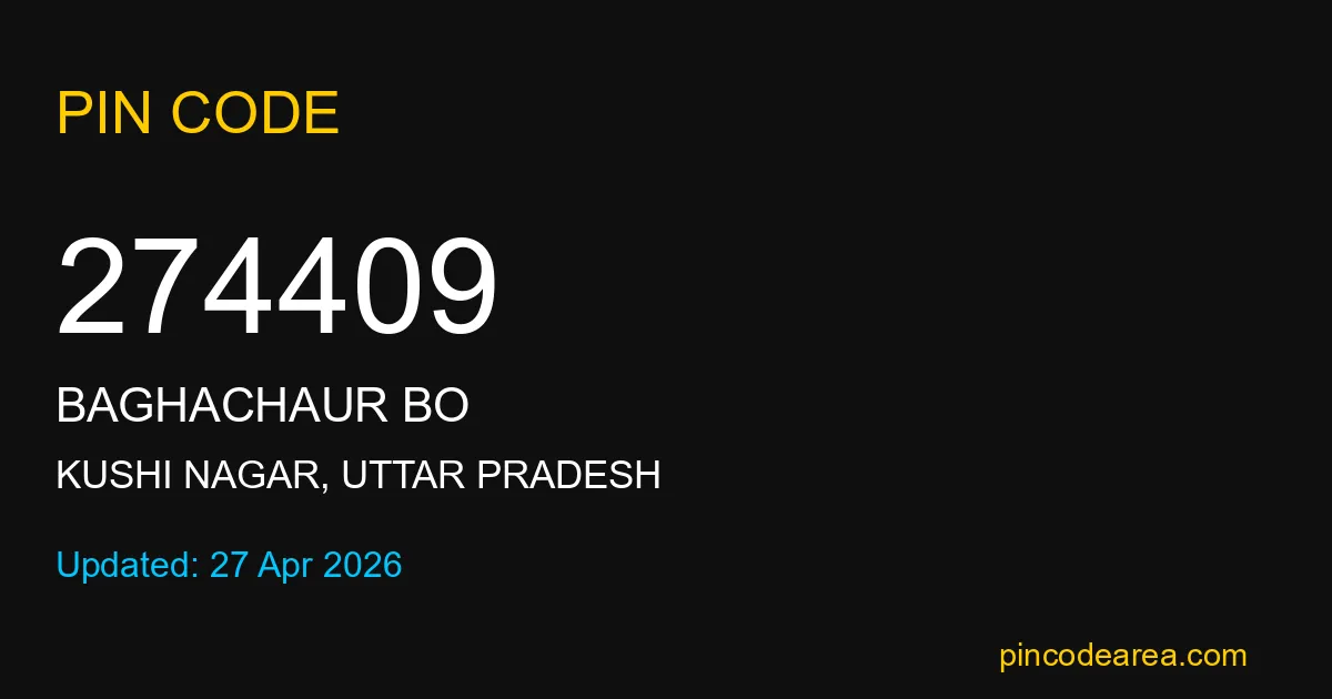 274409 PIN Code is assigned to Baghachaur BO Post Office located in Kushi Nagar district of Uttar Pradesh. It helps identify the exact delivery area for postal and courier services.
