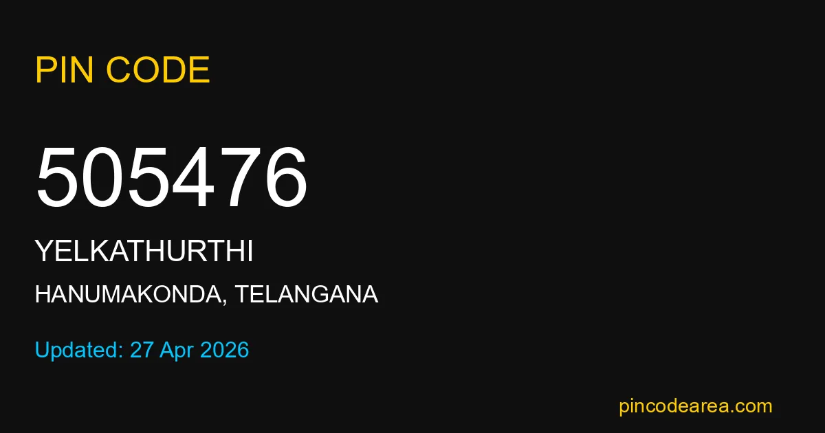 505476 PIN Code is assigned to Yelkathurthi Post Office located in Hanumakonda district of Telangana. It helps identify the exact delivery area for postal and courier services.
