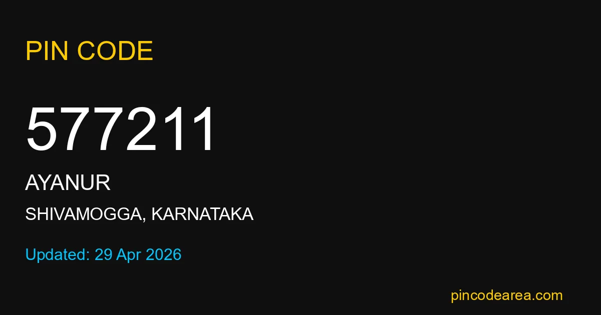 577211 PIN Code is assigned to Ayanur Post Office located in Shivamogga district of Karnataka. It helps identify the exact delivery area for postal and courier services.