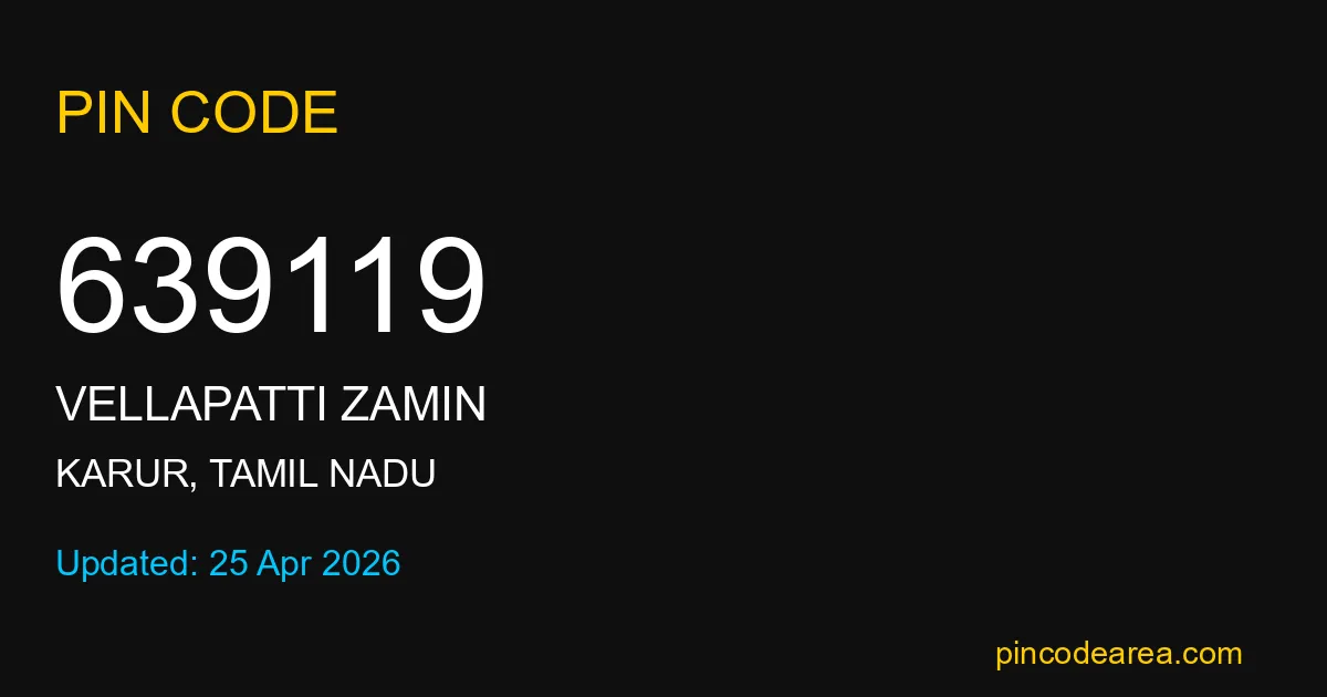 639119 PIN Code is assigned to Vellapatti Zamin Post Office located in Karur district of Tamil Nadu. It helps in identifying the exact delivery area.