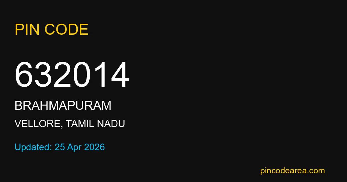 632014 PIN Code is assigned to Brahmapuram Post Office located in Vellore district of Tamil Nadu. It helps in identifying the exact delivery area.