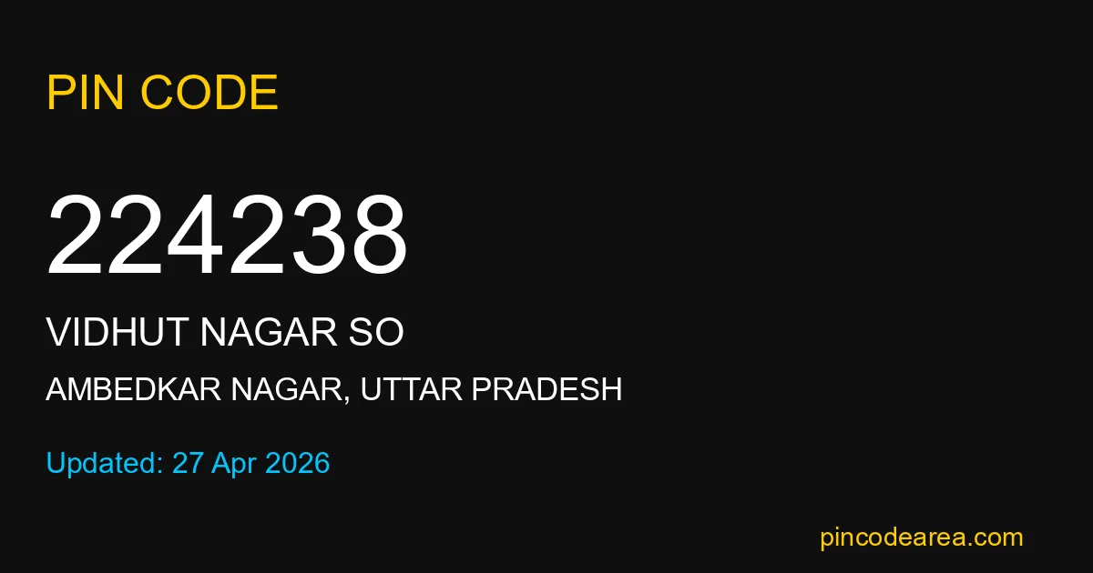 224238 PIN Code is assigned to Vidhut Nagar SO Post Office located in Ambedkar Nagar district of Uttar Pradesh. It helps identify the exact delivery area for postal and courier services.