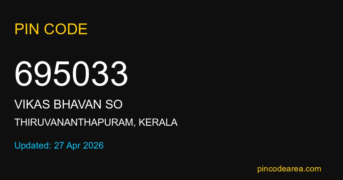 695033 PIN Code belongs to Vikas Bhavan SO Post Office in Thiruvananthapuram district of Kerala, India. This area mainly includes local residential and rural regions where India Post ensures timely mail and parcel delivery services.