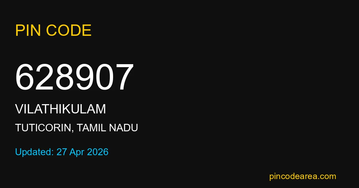 If you are searching for accurate location details, 628907 helps identify the exact postal region of Vilathikulam in Tamil Nadu.
