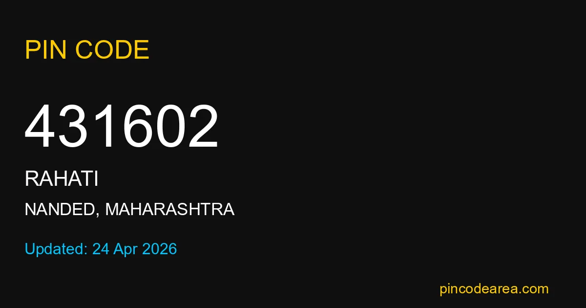 431602 PIN Code is assigned to Rahati Post Office located in Nanded district of Maharashtra. It helps in identifying the exact delivery area.