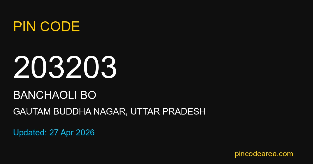 203203 PIN Code is assigned to Banchaoli BO Post Office located in Gautam Buddha Nagar district of Uttar Pradesh. It helps identify the exact delivery area for postal and courier services.