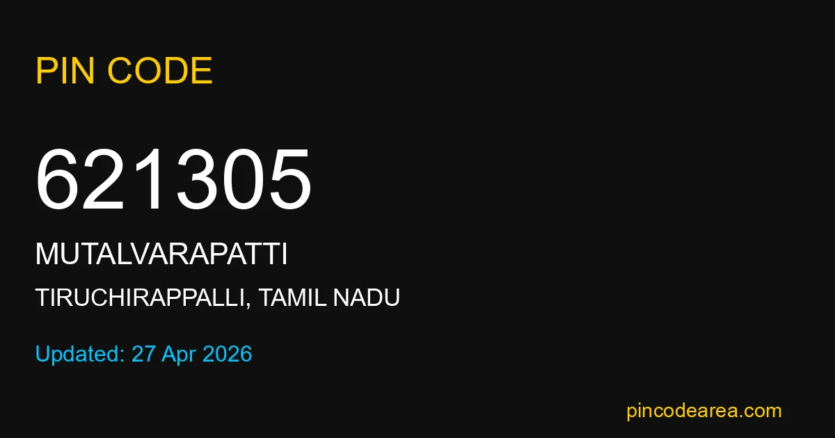 621305 PIN Code belongs to Mutalvarapatti Post Office in Tiruchirappalli district of Tamil Nadu, India. This area mainly includes local residential and rural regions where India Post ensures timely mail and parcel delivery services.
