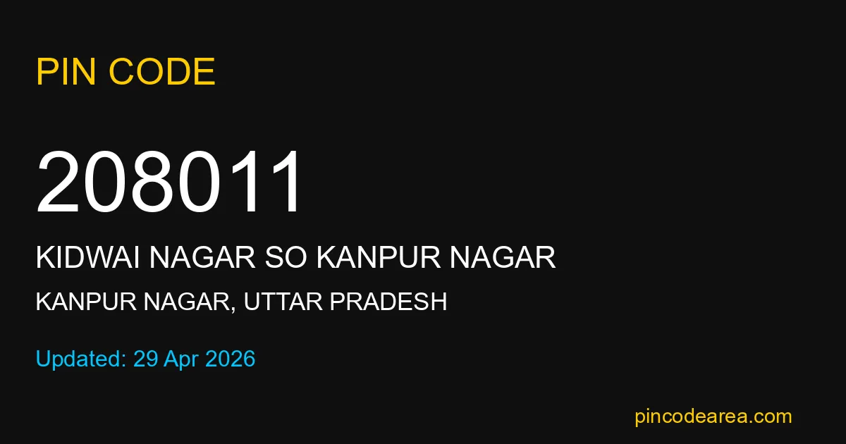208011 PIN Code belongs to Kidwai Nagar SO Kanpur Nagar Post Office in Kanpur Nagar district of Uttar Pradesh, India. This area mainly includes local residential and rural regions where India Post ensures timely mail and parcel delivery services.