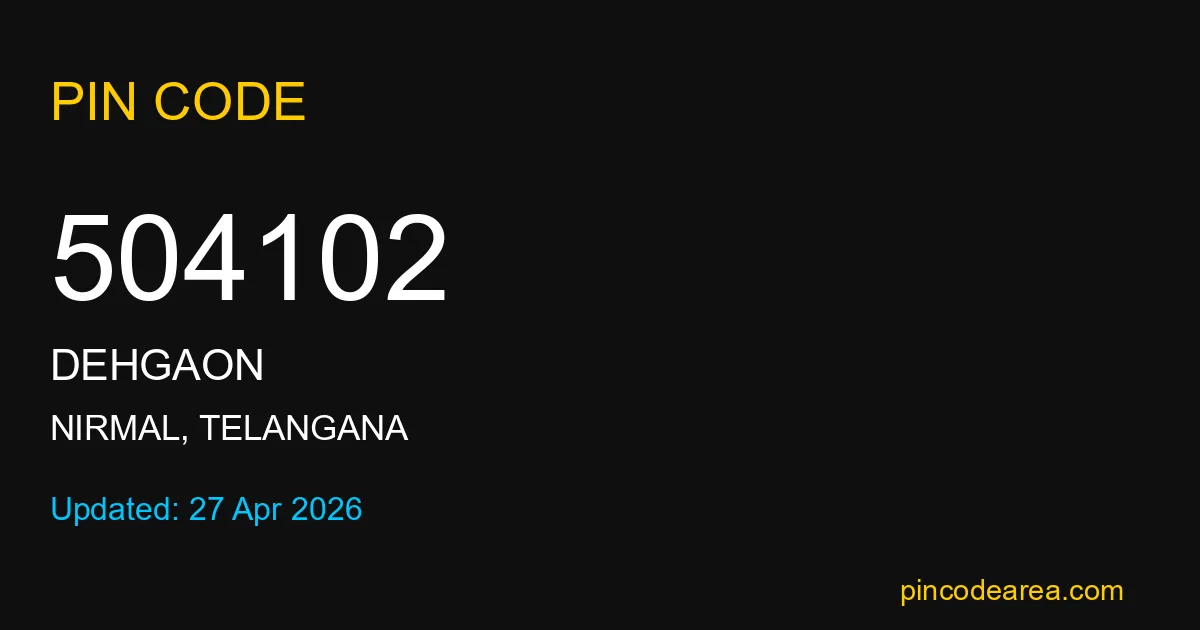 504102 PIN Code is assigned to Dehgaon Post Office located in Nirmal district of Telangana. It helps identify the exact delivery area for postal and courier services.